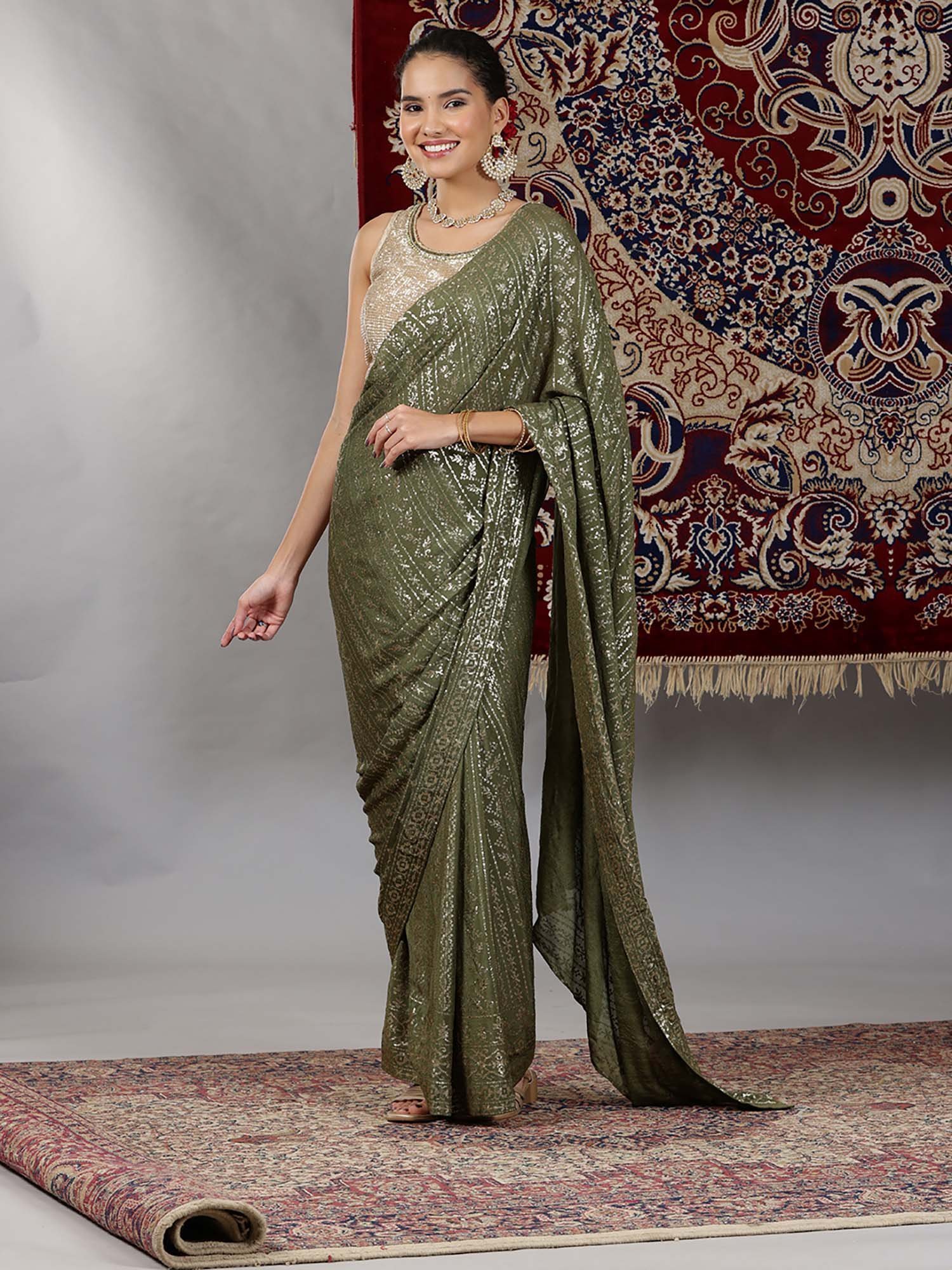 Gold and Green Sequin Embellished Crop Top and Pre-Stitched Saree (Set of 2)
