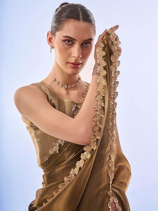 Women’s Organza Lightweight Lace Work Saree With Art Silk Sequence Work Golden Unstitched Blouse Piece